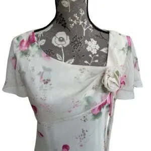Other details: beautiful elegant floral chiffon pull over dress with short flowy sleeves. Side V-neck with decorative flower detail (see picture), fully lined, no zipper, stretchy design, easy to pull over. Elegant dress for wedding guest, cocktail party, outing, church and more.
