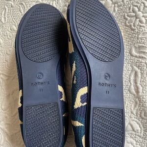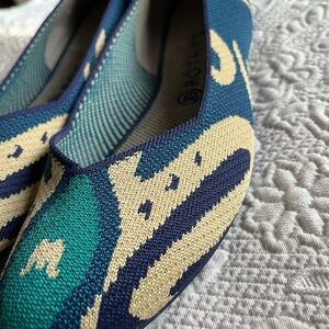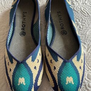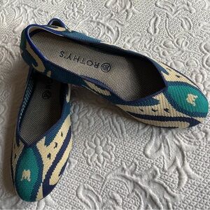 Step out in style with Rothy's women's flats, featuring a chic blue and cream design. Perfect for any occasion, these shoes offer both comfort and elegance.