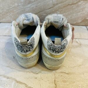 Women's 39 Golden Goose Mid Star sneakers with gray suede, leopard calf-hair star, pink laces, and gold and glitter accents in back. only worn 3-5 times - in excellent condition. Perfect for fashion-forward looks.