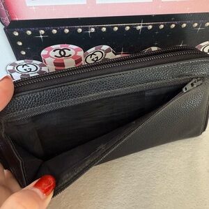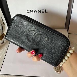 Crafted from Luxurious Black Caviar Leather, this Large Wallet features large CC Logo at front, black zipper pocket on back & Chanel Logo Zip Around closure.