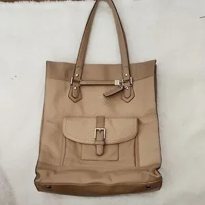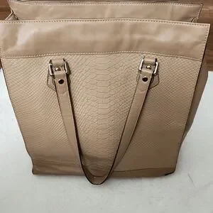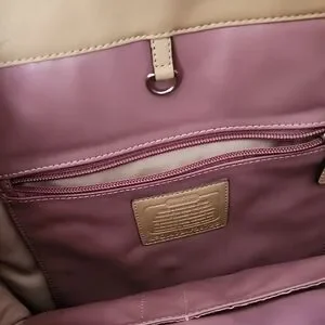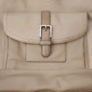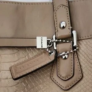 Coach Charlie Embossed Python Leather Tote, style number F28723 or F31283, in a tan or parchment color. This style features a snakeskin-textured front panel, a front snap pocket with a buckle detail, and a dogleash clip closure for the main compartment.