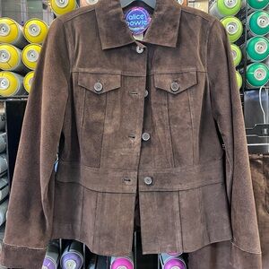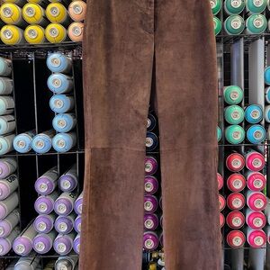 Elevate your style with this elegant brown suede jacket and pants set. Perfect for any occasion, this set offers a sophisticated look with a comfortable fit. Y2K apostrophe brown suede suit size 8