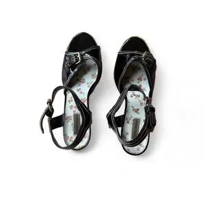 Black patent buckle high heels with ankle straps and tan woven high heels. Delicious brand size 8 1/2 some wear as shown on heel bottoms