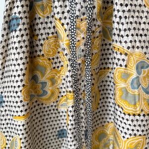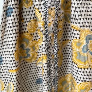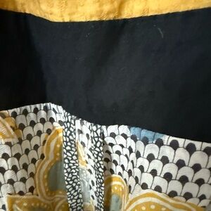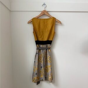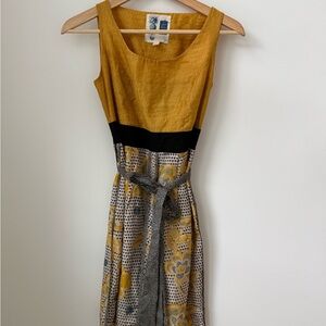 Beautiful Edmé & Esyllte (Anthropologie) sleeveless dress in a standout mixed-print combo: a mustard textured bodice, black waist band, and a playful cream/black pattern skirt with yellow + soft blue floral accents.