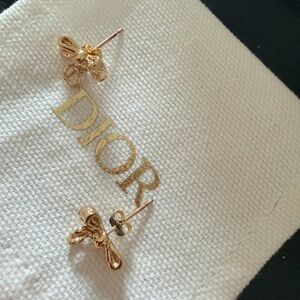 AUTHENTIC Dior Gold Toned CD Bow logo Dangle Stud Earrings. Sooo stunning and classic and HARD TO FIND. Crafted in gold plated stainless steel steel in the highest quality european materials. Small and dainty, gorgeous puffy bows with dangling CD logos from each. Dior engraved in the back.