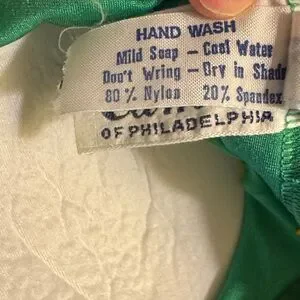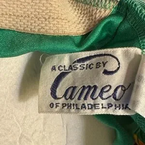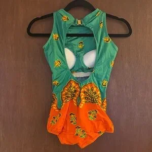 Eye-catching swimsuit with a bold green and orange design. Features a unique pattern and open back.