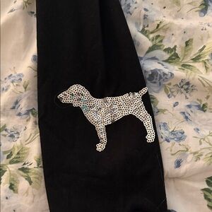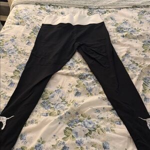 Stylish black leggings featuring a white waistband and a dog logo on the legs. Perfect for casual wear.