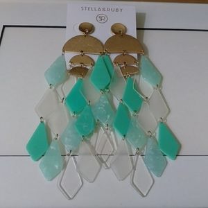 Beautiful statement earrings flutter like winds chime with a multitude of diamond shaped acetate drops suspended from golden semicircles in a cold-turquoise