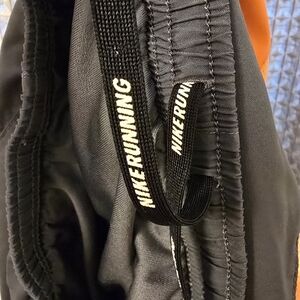 Nike Dri Fit running shorts with a gray base and bold orange trim.