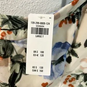 Elegant floral dress with puff sleeves. Features a mix of blue, orange, and navy floral patterns on a cream background.