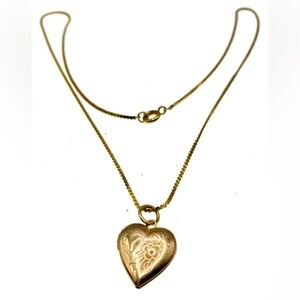 Vintage Gold Tone Engraved Floral Design Heart Locket Pendant Necklace. Dainty piece with minor signs of surface wear consistent with age. In good vintage condition. Chain is 16”, pendant is 5/8”