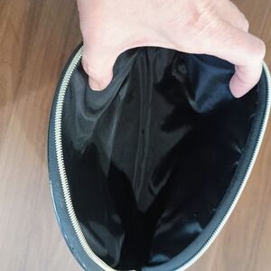 Stylish and elegant, this black and gold cosmetic bag is perfect for organizing your beauty essentials. The chain pattern adds a touch of luxury to your daily routine.