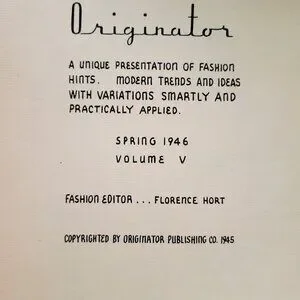 This is an original 1946 Spring Volume V Originator Smart Fashions booklet published by Originator Publishing Co., New York. This charming vintage fashion piece provides a unique presentation of fashion hints, modern trends, ideas and stylish variations smartly applied for the post-war era. The booklet has beautiful mid-century illustrations showing womenโs jackets, skirts, blouses and design details from the Spring 1946 season, with text and visuals aimed at fashion professionals, collectors and enthusiasts. Edited by Florence Hort and copyrighted in 1945 with Spring 1946 Volume V on the title page, this collectible is perfect for vintage fashion collectors, designers, sewing historians, sketchbook enthusiasts, and mid-century style lovers.