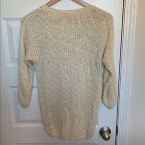 Chic cream sweater with a crochet front panel. Ideal for layering and comfort.