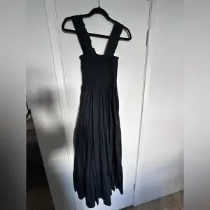 Chic black maxi dress with smocked bodice. Flowy tiered skirt. Perfect for versatile styling.