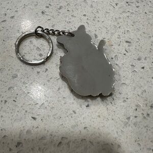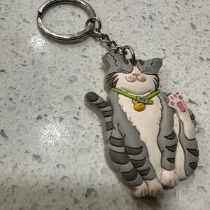 Charming gray cat keychain featuring a cute bell collar. Perfect for cat lovers.