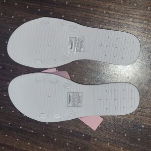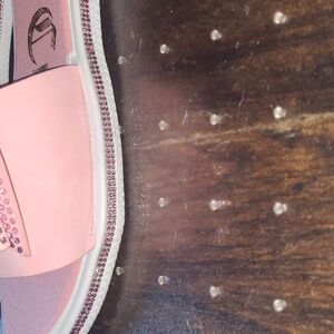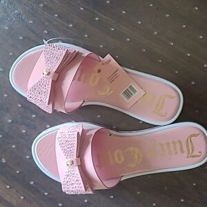 Embrace elegance with Juicy Couture's pink sandals, featuring a dazzling rhinestone bow on the front strap. These slip-on sandals offer a blend of comfort and style, perfect for casual outings.