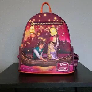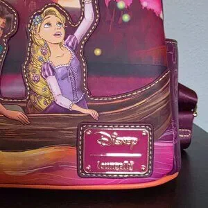 Bring some glowing Disney style to your wardrobe with this Tangled-inspired mini backpack! Featuring an applique of Rapunzel and Flynn on the front, this bag also includes a zippered pocket with a metal lantern zipper pull and glow in the dark details. With debossed lanterns along the body of the bag, this backpack is perfect for trips to the Disney Parks and beyond.
