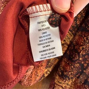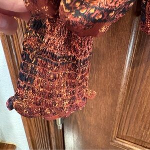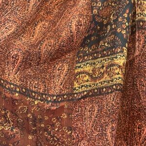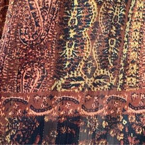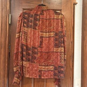 This top features a rich autumnal color palette of rust, chocolate brown, and gold in a sophisticated paisley patchwork print. Subtle metallic gold vertical threading runs through the fabric, adding a hint of shimmer that catches the light beautifully.