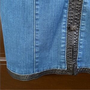 New with tag; Stretchy denim with black faux leather trim a decorative buttons; back zip; button flap pockets; pit to pit measures approx. 20" across and stretches; shoulder to hem measures approx. 38"; smoke free home.