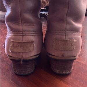 VERY HARD TO FIND Sorel Style. Elegant and sturdy boots. Perfect for cold and wet weather. Durable leather construction with rubber (duck boot style) bottom. Suitable for riding, back country walks in the brush, and treks in wet weather. I bought them for myself but they’re too small. Leather just conditioned. Minimal wear on sole/tread. Small nick on each heel - common to this boot, easy to repair.