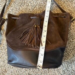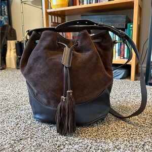 Brown and Black FRYE Suade Leather Paige Drawstring Bucket Bag