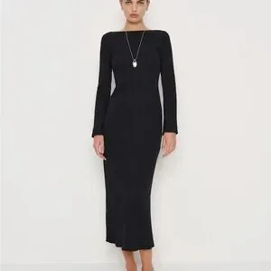 Chic black dress with a daring open back. Long sleeves add elegance. Perfect for evening wear.