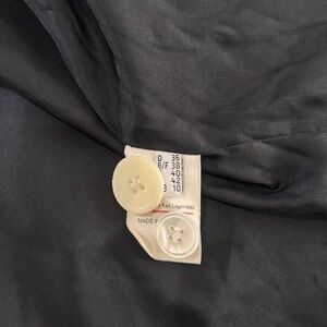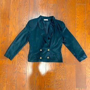 80s 90s Vintage Karl Lagerfeld black cropped blazer tuxedo jacket. One of a kind jacket is viscose but looks like silk. Sexy black blazer with gold buttons and shoulder pads. Very unique vintage piece in great condition.