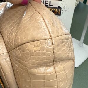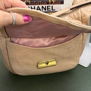 Chic croc-embossed design. Elegant beige tone. Gold-tone accents. Perfect for any occasion. Beautiful bag. Please look at all photos for condition.
