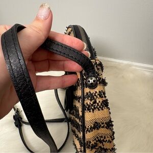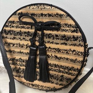 Adorable round crossbody bag with bow and straw striped detailing on the front. Inside has one zip pocket with plenty of storage. 8” x 8”. Strap is 24”. Leather straw material and a faux suede inside. Great condition!