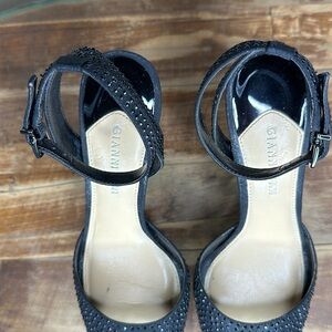 A lovely pair of strappy platform sandals by Gianni Bini in women’s size 9 1/2, medium width. This is an open toe design and is embellished all over. A little bit of the beadwork has fallen off on the sides of one of the shoes, see last 2 photos.