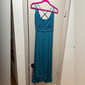 Elegant teal mini dress with lace detailing. Perfect for any occasion.