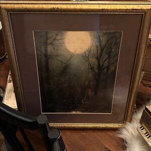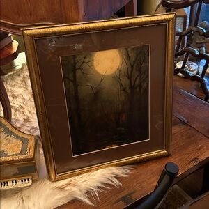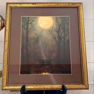 Capture the serene beauty of a moonlit forest with this exquisite art piece. The golden frame adds a touch of elegance to the moody art theme, making it a perfect addition to any eclectic home decor.
