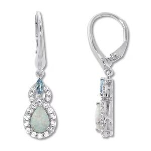 Each of these enchanting earrings for her features a pear-shaped, lab-created opal complemented by a pear-shaped blue topaz. Round lab-created white sapphires form graceful curves along the designs to complete the look. The earrings are styled in sterling silver