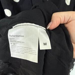 Reformation Rosamund Polka Dot Dress in Black. Women's Size M / Medium. Features long sleeves, allover polkadot print, smocked chest, leg slit, long midi length, lined, and chiffon fabric. 100% viscose. Great used condition, no notable flaws.