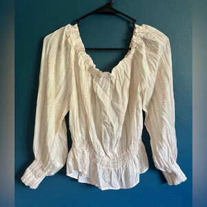 Millibon branded off the shoulder pheasant fit with elastic waist band and loose sleeves. Cream color with orange pattern throughout.