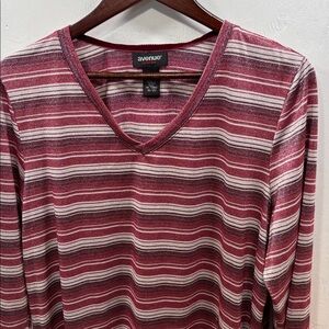 Avenue Casual Strech Metallic Burgandy & Gray V Neck Long Sleeve Top Size 18/20. Stylish Avenue top with burgundy and white stripes. Features a flattering V-neck design.