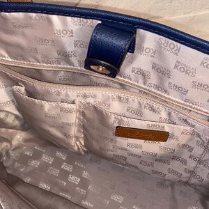 Elegant tote with bold dark blue and white stripes. Features brown handles and gold logo accent. Ideal for versatile use.