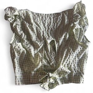 Embrace a fresh, summery look with this Meraki blouse featuring a charming green and white gingham pattern. The flutter sleeves and ruffled wrap design add a touch of elegance, making it a versatile choice for any occasion. Crafted for comfort and style, this top is a delightful addition to your wardrobe.