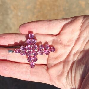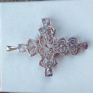 Elegant pink topaz gemstone cross pendant, perfect for adding a touch of sophistication to any outfit. comes from a smoke-free home. just thinning out my mom's jewelry a bit. long including the bale. without the bail it's about an inch and a half or a little more. width is approximately one and a half inches. really beautiful piece. no chain. and not sure if she ever wore it or not. and I was listing this, about what a great gift this would be for a woman battling cancer. it's pink and across. so symbolic. also a great gift for mother's Day or Easter.