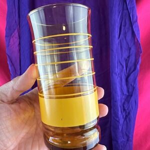 Keywords: 1970s glass, amber tumbler, yellow rings glass, libbey style, libbey glass, retro kitchen decor, dopamine decor, sunny home, vintage drinkware, amber yellow glass, retro barware, colorful glassware, mcm style