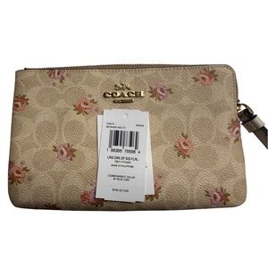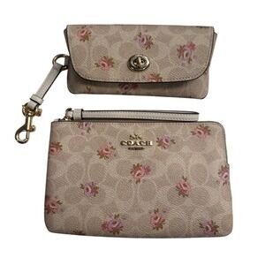 Keywords: Coach wristlet, floral print, signature canvas, double zip, pouch set, khaki multi, gold hardware, designer, small bag, cosmetic bag, clutch, travel accessory, sunglasses
