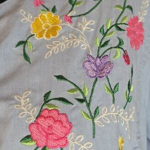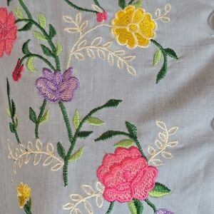 Soft and pretty swing dress. Bright floral embroidery. Button placket, pleated empire bust.