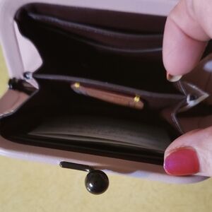 Elegant mauve leather kiss lock wallet by Coach. Perfect for carrying essentials. Sleek and fashionable design.