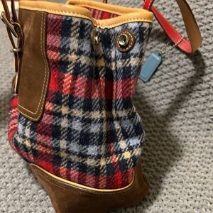 Vintage 2003 Coach wool red and blue plaid handbag. Accented in dark brown suede and tan leather with silver hardware. Bottom has silver stud feet to keep your bag clean. Like new, carried one time. Pristine interior featuring signature C pattern and red leather creed. Includes original blue leather hangtag.