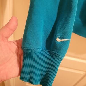 Stylish blue zip-up hoodie with front pockets and drawstring hood. Features bold Nike logo on the front. Tiny hole to front left pocket, see photo.