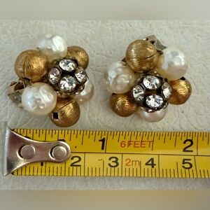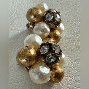 Lisner Gold & Faux Pearl Rhinestone cluster Vintage Flower Clip on Earrings