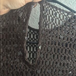 The crochet construction with shimmering sequins adds a modern touch to this sheer midi dress cut in a sheath silhouette.