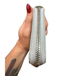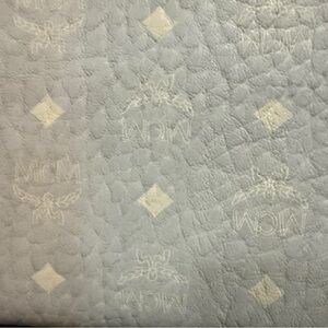 Authentic MCM zip-around continental wallet in signature light blue (ice blue) Visetos coated canvas with leather trim and silver-tone hardware. Accordion-style interior with multiple card slots and a secure zip coin pocket—sleek, structured, and timeless.