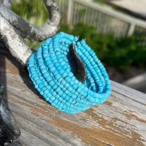 Add a pop of color to your spring and summer outfits with this stunning turquoise beaded cuff bracelet! No, clasps or buckles to mess with, just cuff it on and go!